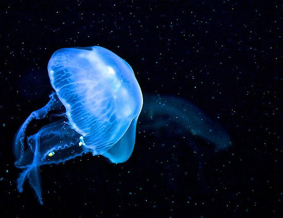 True to its name, moon jellyfish seems like a small moon floating in the oceanic water, and is characterized by four horseshoe-shaped organs which are exposed through its clear bell.