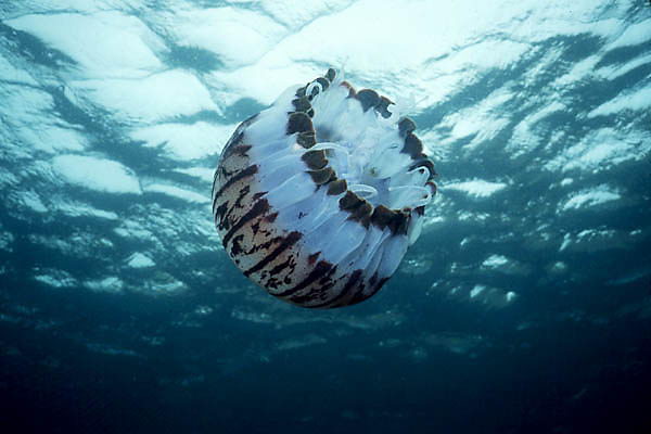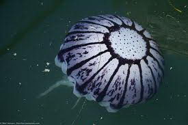 The purple striped jellyfish primarily inhabits the off coast of California (Monterey Bay). It has a bell measuring around 70 cm in diameter.