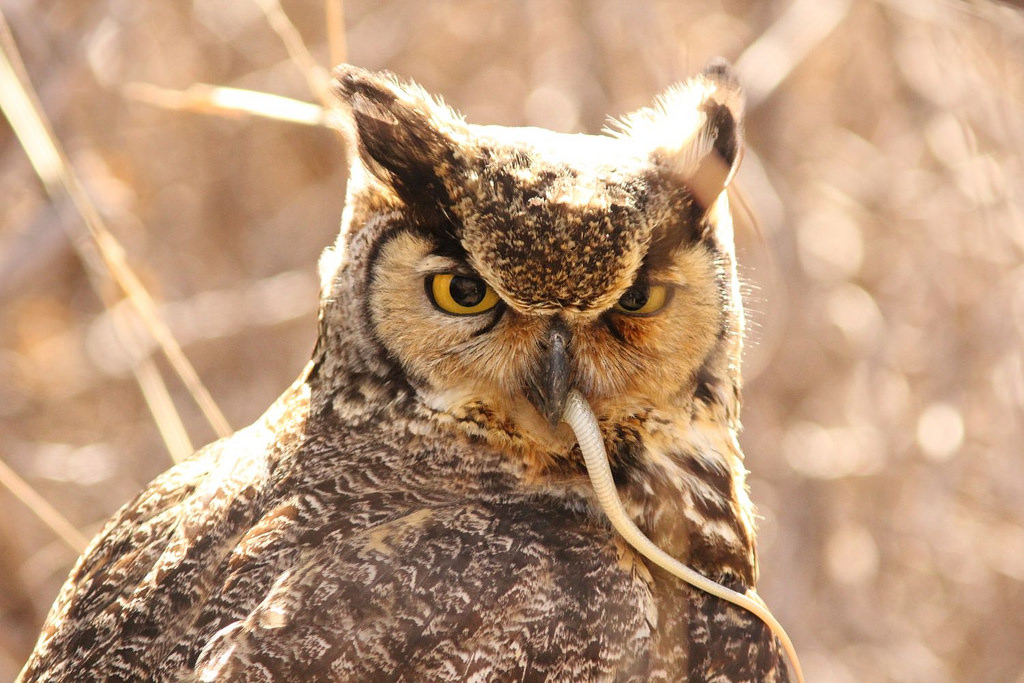 - Alongside birds and mammals, the great horned owl also feeds on reptiles and fish such as prairie rattlesnakes, common king snake, loggerhead turtle, American alligator, black rat snake, night snake, salamander, toad, frogs, goldfish, catfish, eels, crabs, worms, crayfish, scorpions, spiders, grasshoppers, katydids, water bugs, cricket, Jerusalem cricket, and beetle.