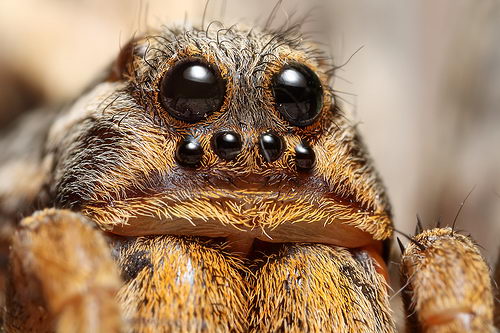 - One of the promising features of wolf spiders is their eyes; two large pairs facing forward while two others facing sideways, accompanied by the four smaller eyes.
